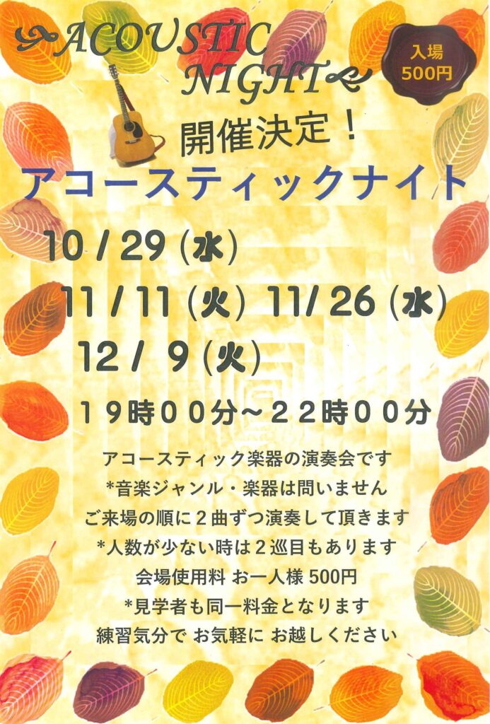 アコースティック楽器の演奏会です、予約不要ですのでお気軽に参加してください。