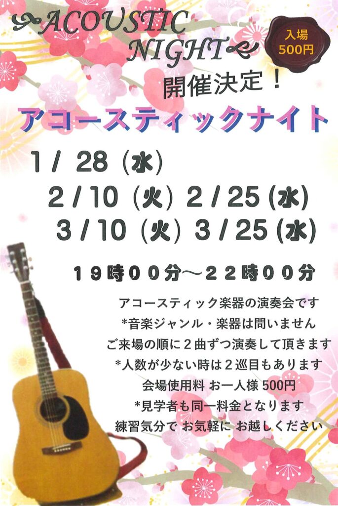 アコースティック楽器の演奏会です、予約不要ですのでお気軽に参加してください。