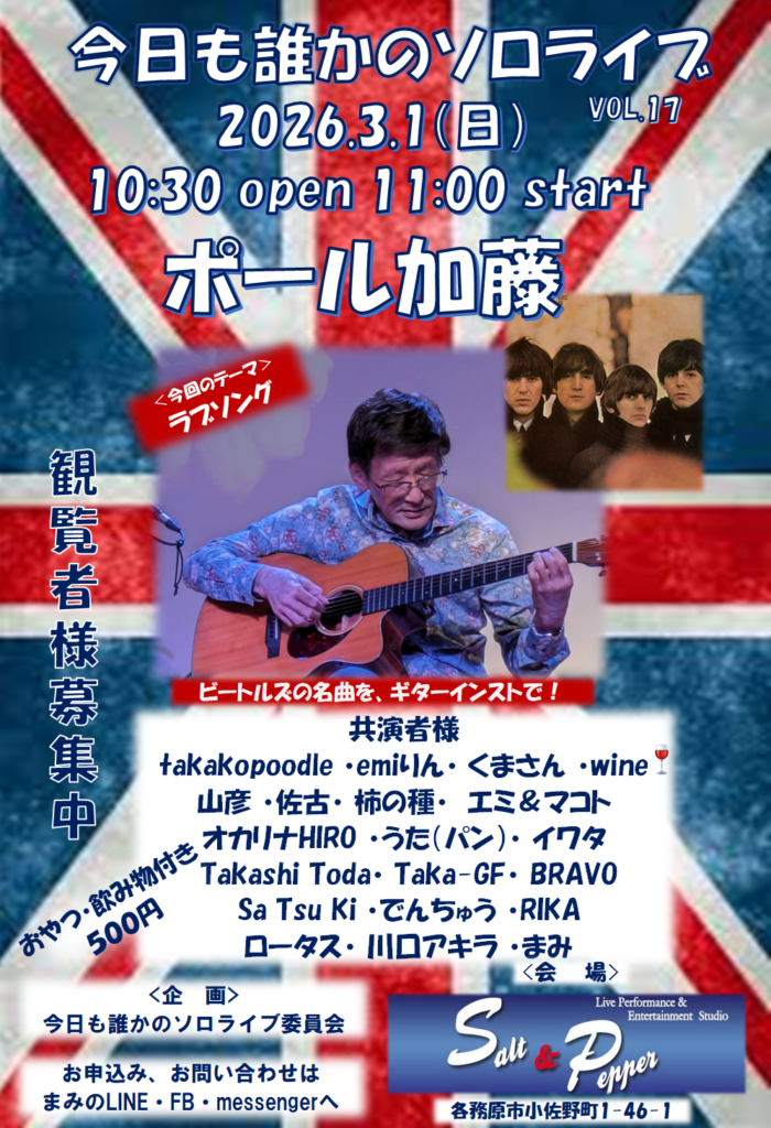 (3/1) 今日も誰かのソロライブ 2025.11.15イベント情報(貸切利用) HOME イベント情報 イベント情報(貸切利用) (3/1) 今日も誰かのソロライブ 主演はポール加藤 テーマはラブソング 【日時】 2026年3月1日(日) 11時00分 【参加会費】 共演者 2000円 観覧 500円 おやつ、飲み物つき ※ 企画 今日も誰かのソロライブ委員会 イベント情報(貸切利用) (3/22) 今日も誰かのソロライブ (2/22) SOLO LIVE サム&エリックwithマンボ