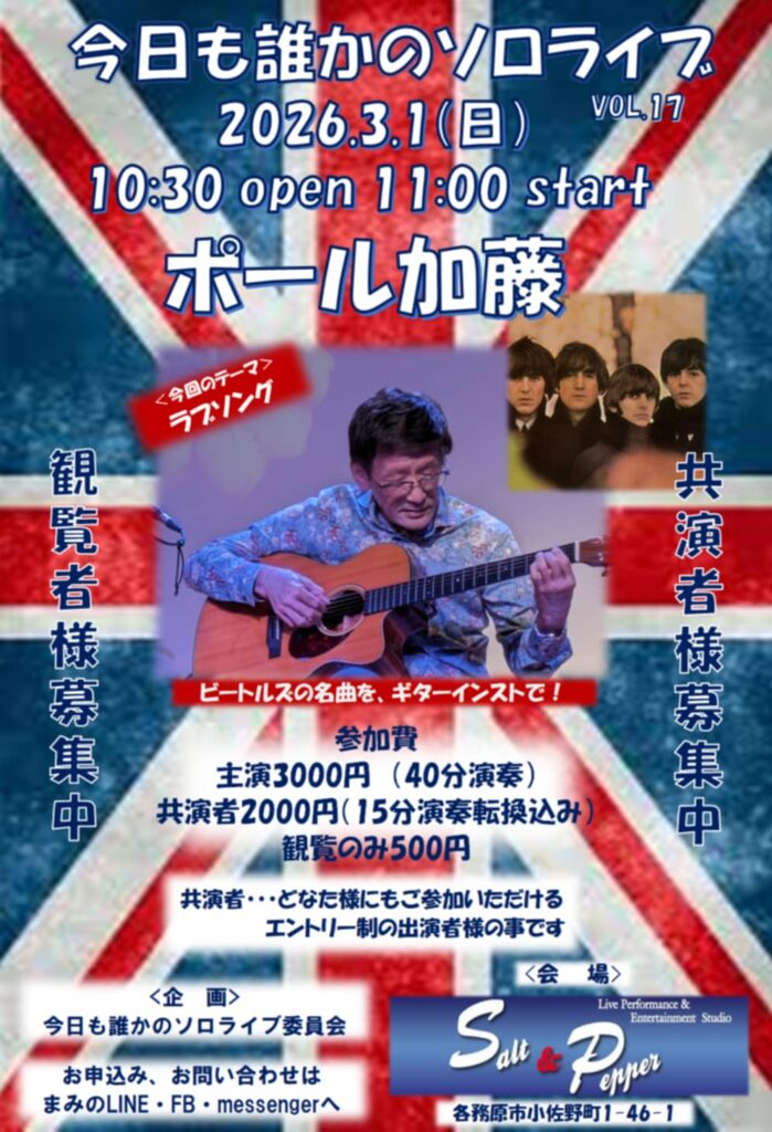 (3/1) 今日も誰かのソロライブ 2025.11.15イベント情報(貸切利用) HOME イベント情報 イベント情報(貸切利用) (3/1) 今日も誰かのソロライブ 主演はポール加藤 テーマはラブソング 【日時】 2026年3月1日(日) 11時00分 【参加会費】 共演者 2000円 観覧 500円 おやつ、飲み物つき ※ 企画 今日も誰かのソロライブ委員会 イベント情報(貸切利用) (終了) 11/16 5Carat(ファイブカラット) (2/15) CONNECTION in Salt&Pepper