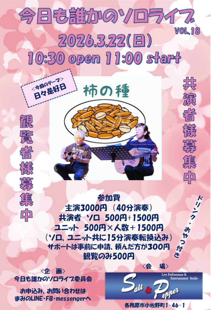 (3/22) 今日も誰かのソロライブ 2025.12.01イベント情報(貸切利用) HOME イベント情報 イベント情報(貸切利用) (3/22) 今日も誰かのソロライブ 主演は柿の種 テーマは日々是好日 【日時】 2026年3月22日(日) 11時00分 【参加会費】 観覧 500円 おやつ、飲み物つき ※ 企画 今日も誰かのソロライブ委員会 イベント情報(貸切利用) (4/11) 今日も誰かのソロライブ レンタル利用について