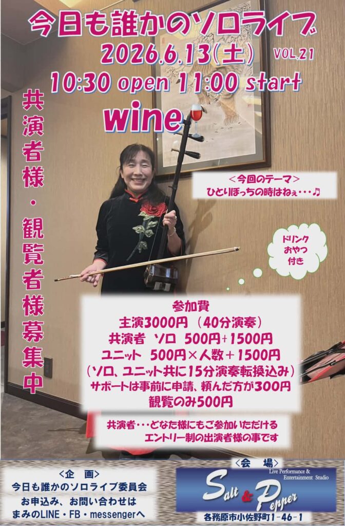 (6/13) 今日も誰かのソロライブ vol.21 2026.03.19イベント情報(貸切利用) HOME イベント情報 イベント情報(貸切利用) (6/13) 今日も誰かのソロライブ vol.21 主演はWine🍷 テーマは、ひとりぼっちの時はねぇ・・・♬ 【日時】 2026年6月13日(土) 11時00分 【参加会費】 観覧 500円 おやつ、飲み物つき ※ 企画 今日も誰かのソロライブ委員会 イベント情報(貸切利用) (7/11) ロータス&柿の種 ツーマンライブ (5/10) 今日も誰かのソロライブ